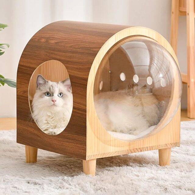 Introduce your beloved cat to the ultimate sleeping experience with our All-Season Wooden Space Capsule Cat Bed. This meticulously crafted cat bed is not just a sleeping area; it’s a personal retreat for your cat, ensuring warmth, comfort, and privacy. Designed for universal appeal, it fits cats of all sizes, making it the perfect haven for your furry friend.