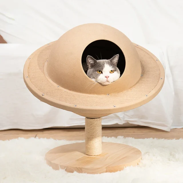 Our Space Capsule Cat Nest boasts a unique blend of functionality and whimsy. The flying saucer toy encourages active play, while the climbing rack and cozy nest offer perfect spots for exercise and naps. Made from high-quality wood, this non-smart device is both durable and environmentally friendly, ensuring your cat’s health and happiness. Here’s what makes our product stand out: