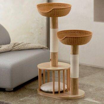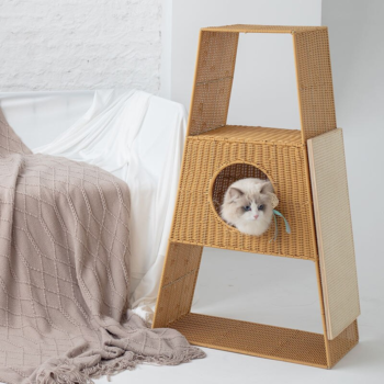 Luxury Three-Story Rattan Woven Cat House with Scratch Board & Claw Grinder