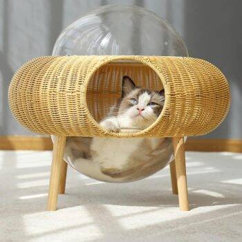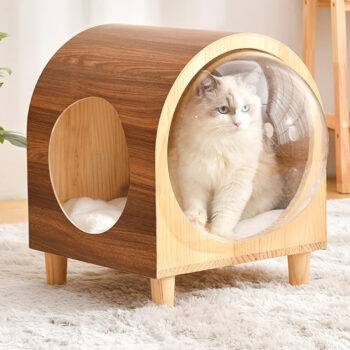 All-Season Wooden Space Capsule Cat Bed with Plush Cushion